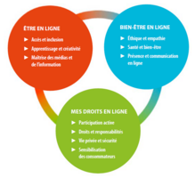 Le Conseil de l’Europe a élaboré un manuel sur la citoyenneté numérique, identifiant dix compétences réparties en trois axes principaux :