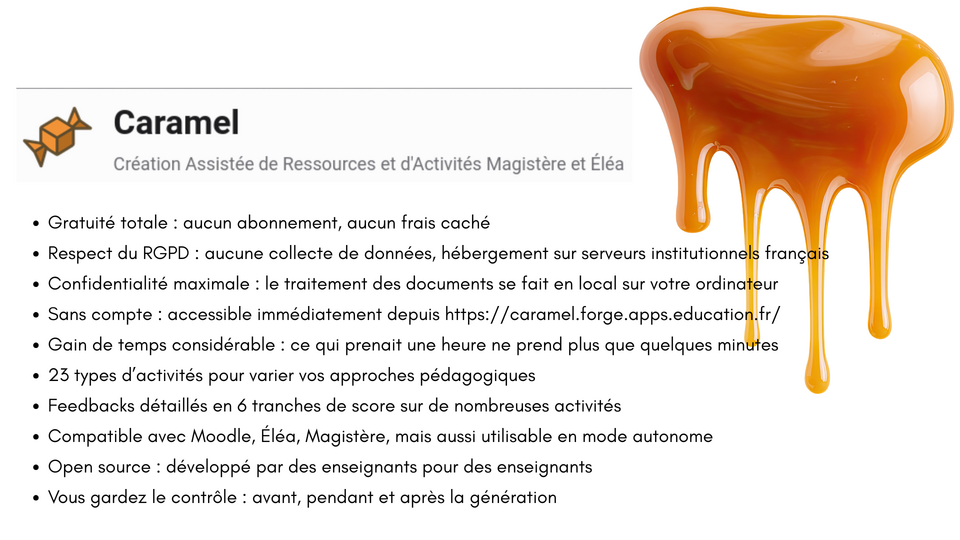 Caramel est un outil permettant aux enseignants de créer en quelques clics des activités pédagogiques interactives au format H5P ou Moodle/Éléa grâce à l’IA.