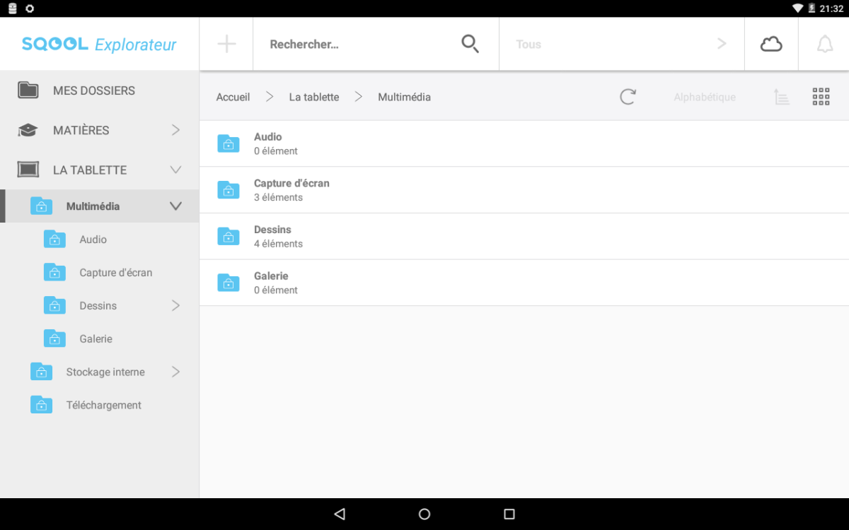 Il faut comprendre que lorsqu'un utilisateur, élève ou prof, va enregistrer un fichier, ce sera dans l'espace "La Tablette", soit dans movies s'il s'agit d'une vidéo, soit dans pictures s'il s'agit d'une image, soit dans documents s'il s'agit d'un document WPS office, ......., soit ailleurs potentiellement s'il s'agit d'un fichier provenant d'une application spécifique (geogebra par exemple).
