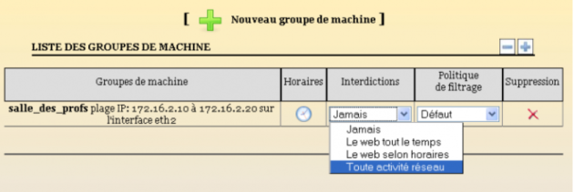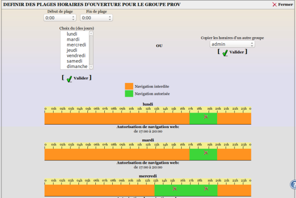 “Le web selon horaires” : Le groupe de machines ne peut accéder à l'internet que sur une plage horaire définie. ( voir définition des plages horaires ci-après)