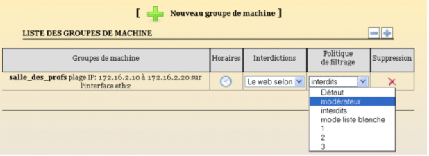 “Modérateur” : Lorsqu'un site interdit est consulté, un lien est proposé pour outrepasser cette interdiction. Cela peut être utile par exemple pour la salle des professeurs.