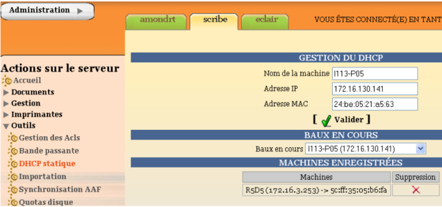 Dans l'EAD du Scribe, on utilise le menu "DHCP statique" qui permet de faire de la réservation d'IP.