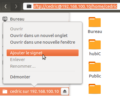 ssh://<nom_utilisateur>@<adresse_ip_distant>Un fois monté, on peut cliquer-droit sur le dossier dans la partie de gauche puis cliquer sur Ajouter un signet :
